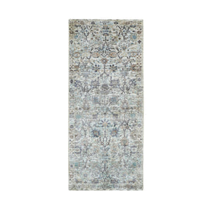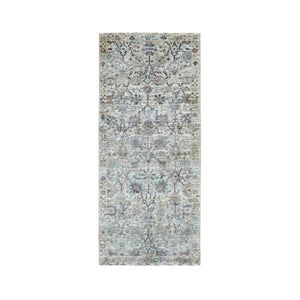 2'5"x12' Ivory Silk With Textured Wool Tabriz Design Runner Hand Knotted Oriental Rug FWR349182