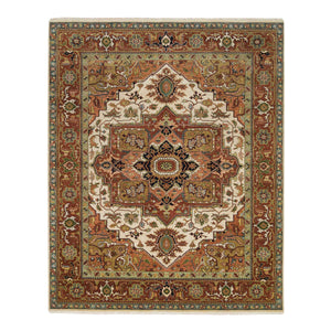 7'9"x9'9" Ivory And Rust, Heriz With Classic Geometric Medallion Design, Thick And Plush, Pure Wool, Hand Knotted, Oriental Rug FWR391578