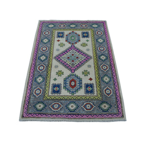3'2"x4'10" Colorful Ivory Fusion Kazak Organic Wool Hand Knotted Oriental Rug FWR332412