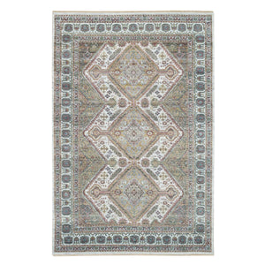 6'1"x9' Ivory, Shiraz Reimagined Unique Flower Rosettes Border Design, Thick And Plush Soft Pile, Natural Wool, Hand Knotted, Tone On Tone, Sustainable Oriental Rug FWR393462
