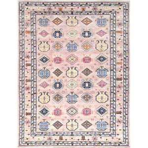 8'10"x12' Blush Pink, Dense Weave Organic Wool, Hand Knotted Afghan Super Kazak With Tribal Geometric Medallions, Vegetable Dyes, Oriental Rug FWR493734