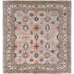 9'9"x9'9" Silver Pink, Afghan Super Kazak With Geometric Medallions, Vegetable Dyes Dense Weave, Organic Wool Hand Knotted, Square Oriental Rug FWR493914
