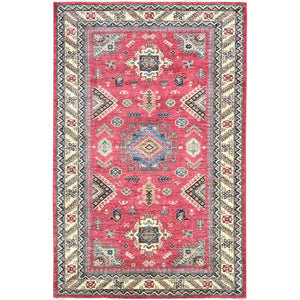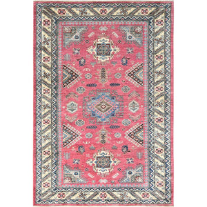 6'x9'1" Rouge Pink, Natural Dyes Densely Woven, Organic Wool Hand Knotted, Afghan Super Kazak With Large Medallion, Oriental Rug FWR495864