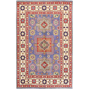 4'x6'1" Iris Purple, Kazak With Geometric Medallions Design, Hand Knotted, Soft And Shiny Wool, Vegetable Dyes, Denser Weave, Oriental Rug FWR2502