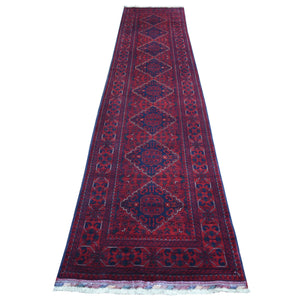 2'7"x9'7" Deep And Saturated Red, Hand Knotted Afghan Khamyab With Geometric Design, Velvety Wool, Runner Oriental Rug FWR428238