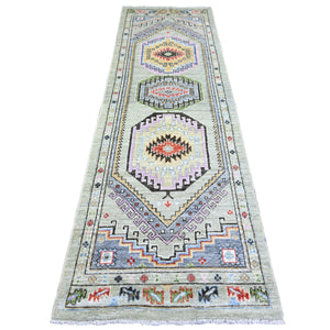 3'x10' Taupe, Pure Wool, With Multi Color Afghan Angora Oushak, Natural Dyes, Hand Knotted, Runner Oriental Rug FWR441216