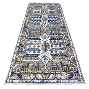 3'x11'4" Mushroom Gray, Anatolian Village Inspired With Large Design Elements And Bird Figurines Pure Wool Hand Knotted, Oriental Runner Rug FWR530232