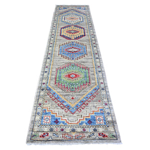 3'1"x9'5" Chrome Silver, Colorful, Hand Knotted Anatolian Village Inspired With Patch Work Design, Natural Dyes Denser Weave, Soft And Velvety Wool, Runner Oriental Rug FWR530214