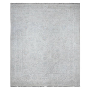 8'3"x9'9" Pacific Pearl White, Soft Wool Weft, Faded Afghan Angora Oushak, Hand Knotted, Vegetable Dyes With Village All Over Floral Design, Oriental Rug FWR537306