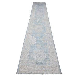 4'2"x12' Powder Blue, Angora Oushak, Hand Knotted, Afghan Vegetable Dyes, Rural Floral Design, Wool Weft, Wide Runner Oriental Rug FWR537390