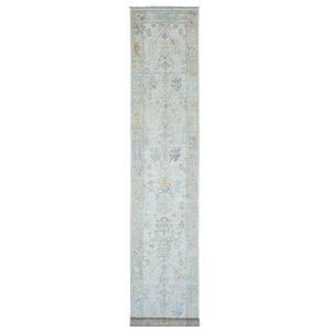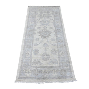 2'10"x10' Pearl White, Afghan Angora Oushak With Cypress Tree Design, Veggie Dyes, Pure Wool, Hand Knotted, Runner, Oriental Rug FWR539268
