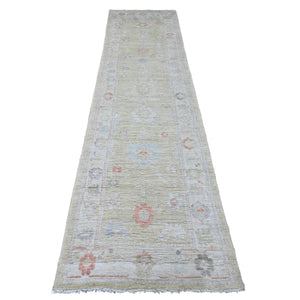 3'1"x10' Pastel Gray, Pure Wool, Afghan Angora Oushak With Soft Color Leaf Design, Hand Knotted, Natural Dyes, Runner, Oriental Rug FWR539580