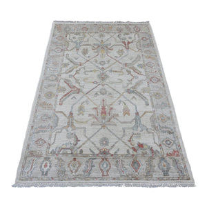 3'10"x5'10" Pearl White, Afghan Angora Oushak With Colorful Leaf Design, Hand Knotted, Veggie Dyes, 100% Wool, Oriental Rug FWR123408
