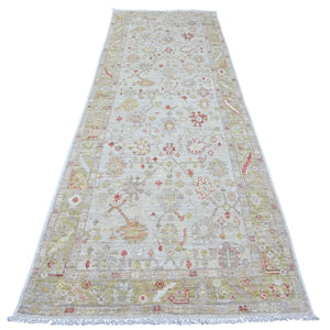 4'1"x11'7" Alabaster White, Hand Knotted, Afghan Angora Oushak With Floral Pattern, Natural Dyes, 100% Wool, Wide Runner, Oriental Rug FWR123378