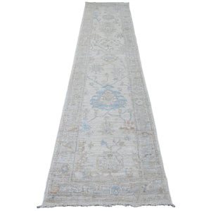 2'8"x12'4" Alabaster White, Hand Knotted, Afghan Angora Oushak With Large Leaf Design, Veggie Dyes, 100% Wool, Runner, Oriental Rug FWR123492