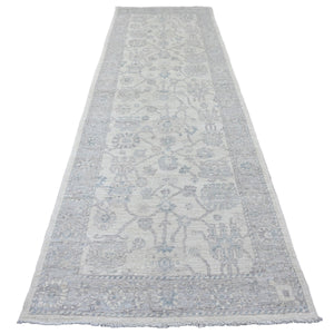 3'10"x10' Alabaster White, Hand Knotted, Afghan Angora Oushak With Colorful Leaf Design, Vegetable Dyes, 100% Wool, Runner, Oriental Rug FWR124602