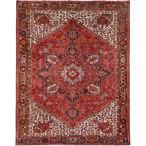 9'8"x12'9" Imperial Red With Ivory Corners, Pure Wool, Hand Knotted, Semi Antique Bohemian Persian Heriz, Good Condition, Rustic Feel, Sides And Ends Professionally Secured, Cleaned, Oriental Rug FWR512190