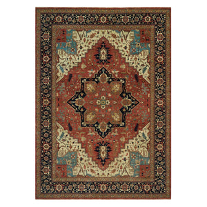 10'x14' Bruschetta Red With Chiffon Ivory Corners, Pure Wool Hand Knotted Antiqued Fine Heriz Re-creation, Vegetable Dyes, Densely Woven, Oriental Rug FWR541608