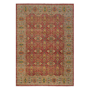 10'x14'2" Scarlet Red, Antiqued Oushak Reimagined, Sheared Low, Pure Wool, Hand Knotted, Repetitive Star And Rosette Design, Oriental Rug FWR547044