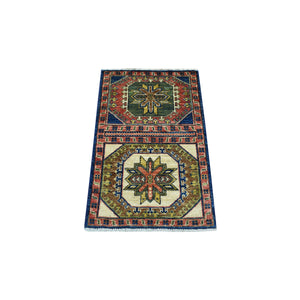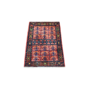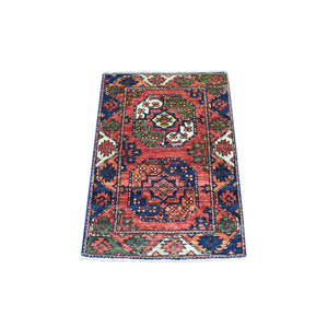 1'10"x3' Red Afghan Ersari Tribal Design Hand Knotted Organic Wool Oriental Rug FWR340584