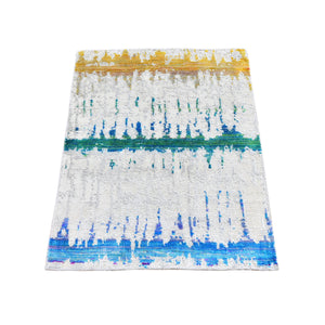 2'x3' Blue Striae Design Silk With Textured Wool Hand Knotted Oriental Rug FWR357246