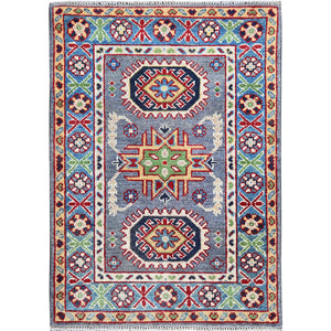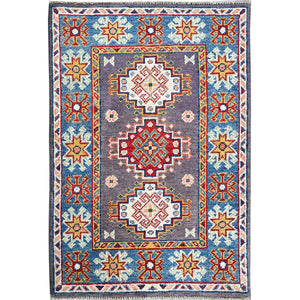 2'x3' Lilac Gray, Kazak With Geometric Medallions Design, Vegetable Dyes, Hand Knotted, Soft Wool, Denser Weave, Sample, Mat, Oriental Rug FWR2214
