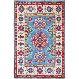 2'1"x3' Powder Blue, Kazak With Geometric Pattern, Soft And Shiny Wool, Vegetable Dyes, Hand Knotted, Denser Weave, Sample, Mat, Oriental Rug FWR2190