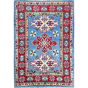 2'x3' Maya Blue, Kazak With Tribal Medallions Design, Hand Knotted, Vegetable Dyes, Soft Wool, Denser Weave, Sample, Mat, Oriental Rug FWR2250
