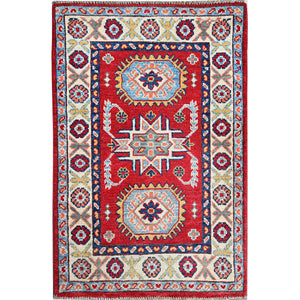 2'1"x3' Scarlet Red, Kazak With Geometric Medallion Design, Vegetable Dyes, Hand Knotted, Soft And Vibrant Wool, Denser Weave, Sample, Mat, Oriental Rug FWR2322
