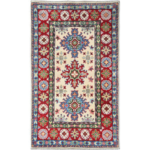 2'6"x4'1" Alabaster White, Kazak With Geometric Medallions Design, Hand Knotted, Vegetable Dyes, Soft Wool, Denser Weave, Sample, Mat, Oriental Rug FWR2358