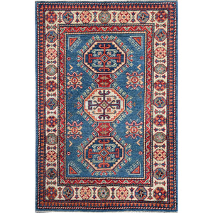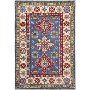 2'9"x4'1" Yonder Blue, Kazak With Tribal Design, Vegetable Dyes, Hand Knotted, Denser Weave, Soft And Shiny Wool, Sample, Mat, Oriental Rug FWR2424