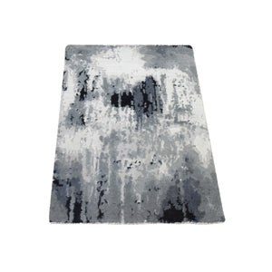 2'x3' Black With Touches Of Ivory, Hand Knotted, Abstract Design, Wool And Silk, Oriental, Mat, Sample, Rug FWR470412