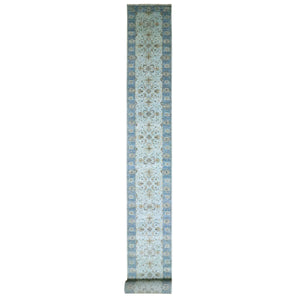 2'8"x29'9" Shades Of Blue With Cornsilk White, Shiny Wool, Hand Knotted Vegetable Dyes, Shah Abbas Agra Floral Motifs, Densely Woven Xl Runner Oriental Rug FWR456234