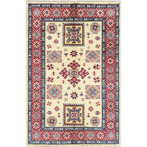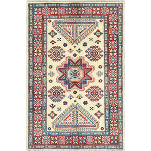 3'x4'7" Afghan Special Kazak With Colorful Pattern, Natural Wool, Hand Knotted, Ivory, Caucasian Design, Oriental Rug FWR370854