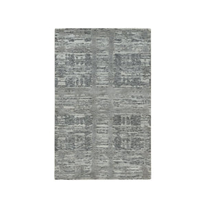 3'x5'1" Ash Gray, Modern Criss Cross Erased Design, Hand Spun Undyed Natural Wool, Hand Knotted, Oriental Rug FWR395766