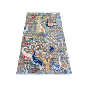 3'x5' Laid Back Gray, Birds Of Paradise, Abrash, Tree Of Life Hand Knotted 100% Wool Afghan Peshawar Area, Oriental Rug FWR447594