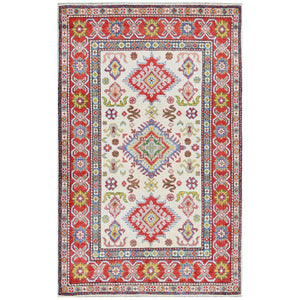 3'2"x5'3" Pearl White, Hand Knotted, Kazak With Geometric Medallions Design, Soft And Velvety Wool, Vegetable Dyes, Denser Weave, Oriental Rug FWR2490
