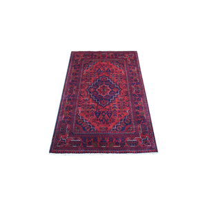 3'3"x4'10" Hand Knotted Afghan Khamyab Geometric Medallion Design Denser Weave With Shiny Wool Deep And Saturated Red Oriental Rug FWR406902