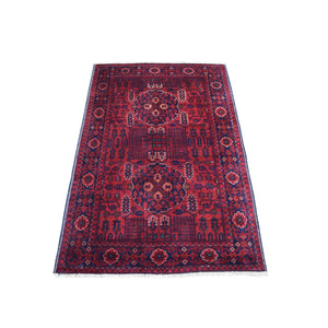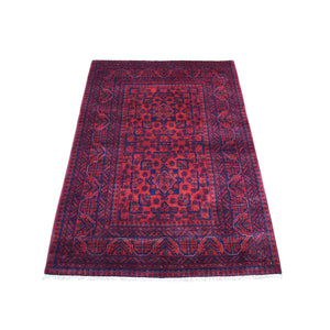 3'3"x4'10" Hand Knotted Saturated Red Denser Weave With Shiny Wool Afghan Khamyab Tribal Design Oriental Rug FWR407742
