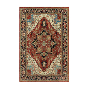 6'x9'1" Tanager Red With Club Navy Blue, Antiqued Fine Heriz, Re-creation, Hand Knotted All Wool Plush Pile, Densely Woven, Vegetable Dyes, Oriental Rug FWR543858