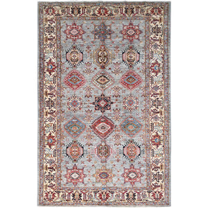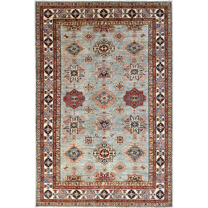 6'x9' Belgian Block Gray, Afghan Hand Knotted Super Kazak With Tribal Medallions, Vegetable Dyes Denser Weave, Soft Wool Oriental Rug FWR519378