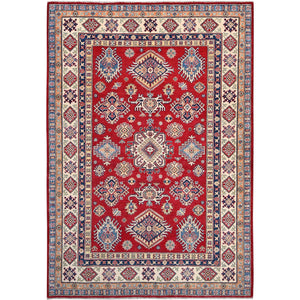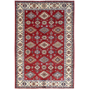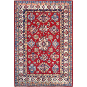 6'1"x8'10" Toreador Red With Chantilly Lace White, Soft And Shiny Wool, Hand Knotted, Denser Weave, Vegetable Dyes, Afghan Super Kazak With All Over Medallions, Oriental Rug FWR521328