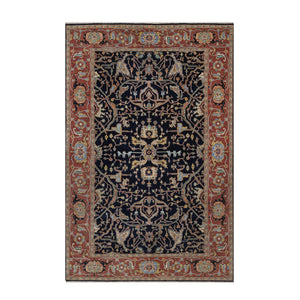 6'x9'3" Braves Navy Blue, Hand Knotted, Hand Spun New Zealand Wool, Soft Pile, Vegetable Dyes, Antiqued Fine Heriz Re-creation, All Over Design, Oriental Rug FWR551652