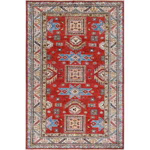 6'x9' Hand Knotted Rich Red Afghan Super Kazak With Large Medallions Design Pure Wool Oriental Rug FWR369942