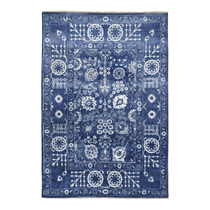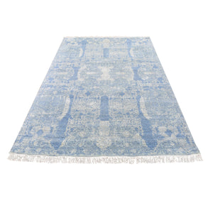 6'1"x9'1" Blue And White Extremely Durable Modern Hand Knotted Pure Silk And Textured Wool Oriental Rug FWR401742