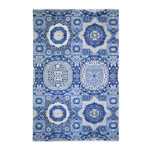 6'x9'3" Queen Blue, Grass Design Dense Weave, Tone On Tone Soft Pile, Wool And Silk Hand Knotted, Oriental Rug FWR476184