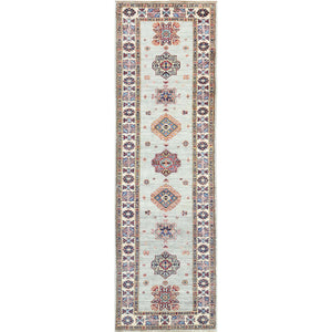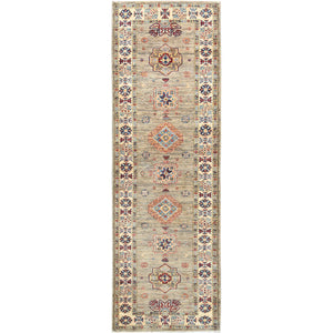 2'7"x8'5" Ash Gray, Soft Wool Hand Knotted, Afghan Super Kazak With Geometric Medallions, Natural Dyes Densely Woven, Runner Oriental Rug FWR496392