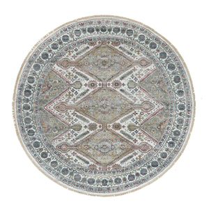 8'x8' Pearl White, Natural Dyes, Soft And Vibrant Pile, Hand Knotted, Pure Wool, Unique Flower Rosettes Border Design, Shiraz Reimagined, Round Sustainable Oriental Rug FWR395154