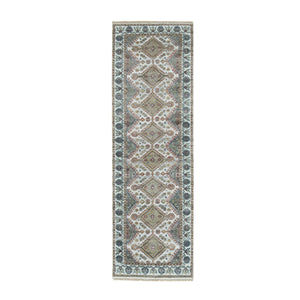 2'7"x7'9" Acoustic White, Hand Knotted, Karajeh Design Tribal Medallions, Extra Soft Wool, Runner Oriental Rug FWR507642