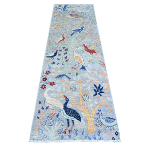 2'7"x8'3" Blue Gray, 100% Wool, Hand Knotted, Birds Of Paradise Afghan Peshawar Design, Vegetable Dyes, Round Oriental Rug S74915